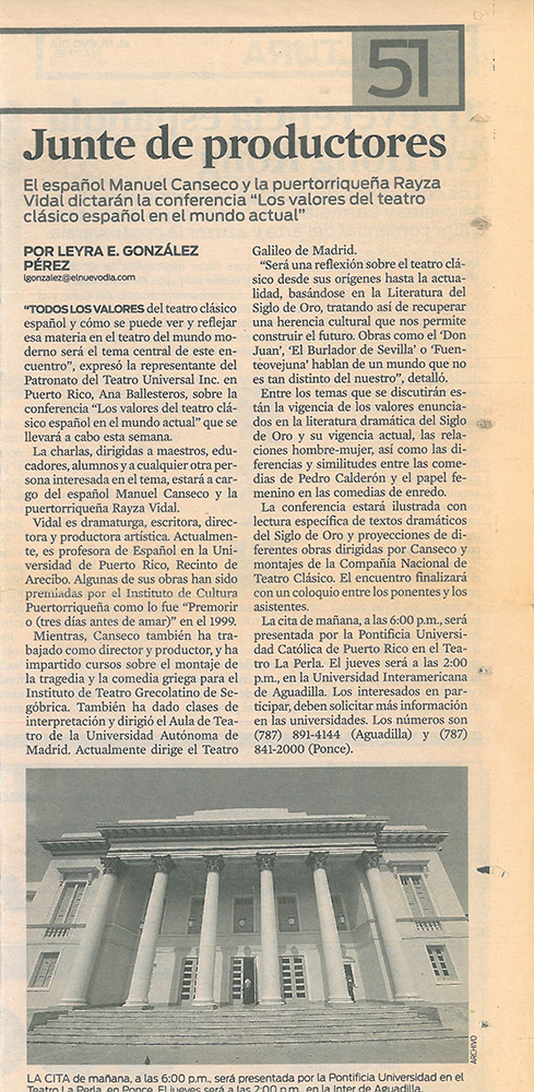Conferencia sobre «Los Nuevos Valores del teatro clásico español» en el mundo actual, con el propósito de Intercambio Cultural, con el Director de teatro clásico y gerente del Teatro Galileo de Madrid, Manuel Canseco, y con la dramaturga y escritora de Puerto Rico, Rayza Vidal. La Conferencia tuvo lugar en el Teatro de la Perla en Ponce, Universidad Pontificia Católica, Inter de Aguadilla y en la Casa de España.