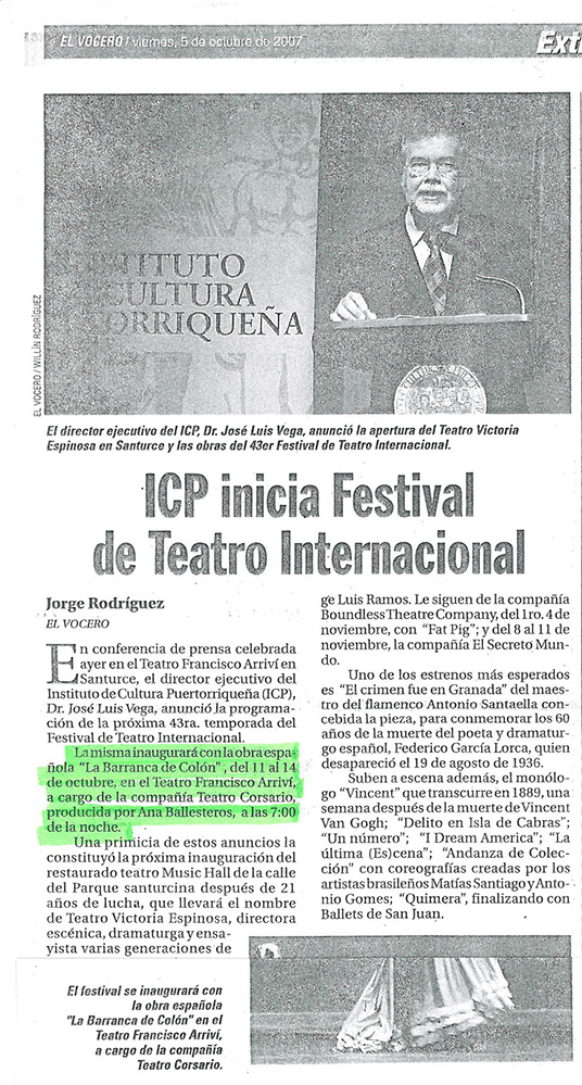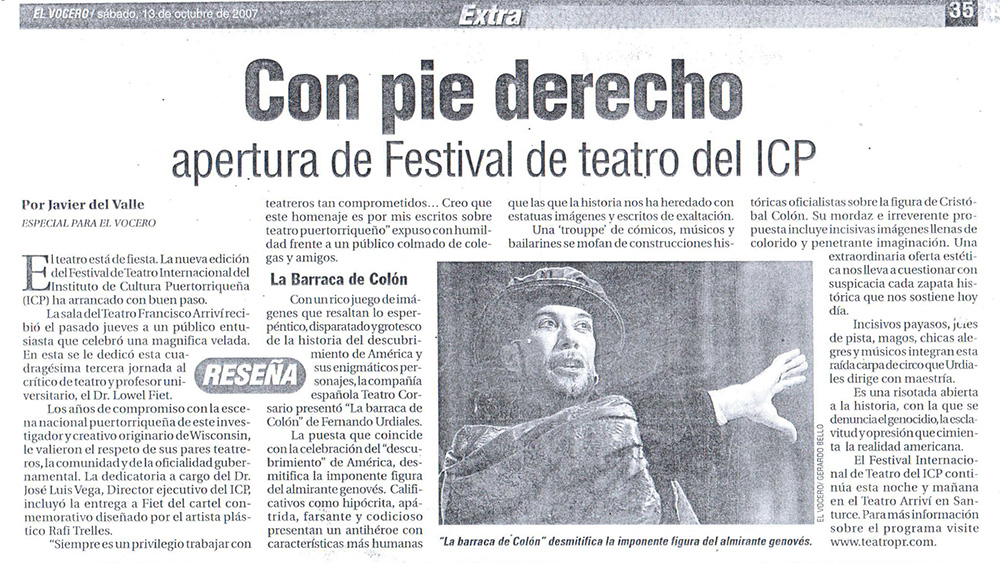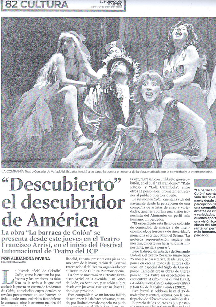 Intercambio Cultural con el ICP teatro Corsario de Valladolid, que por segunda vez participan, esta vez abriendo el Festival Internacional de Teatro con «La barraca de Colón» de Fernando Urdiales, Director de la Compañía, llevada a cabo en Universidades de la Interamericana, UPR y Escuelas.