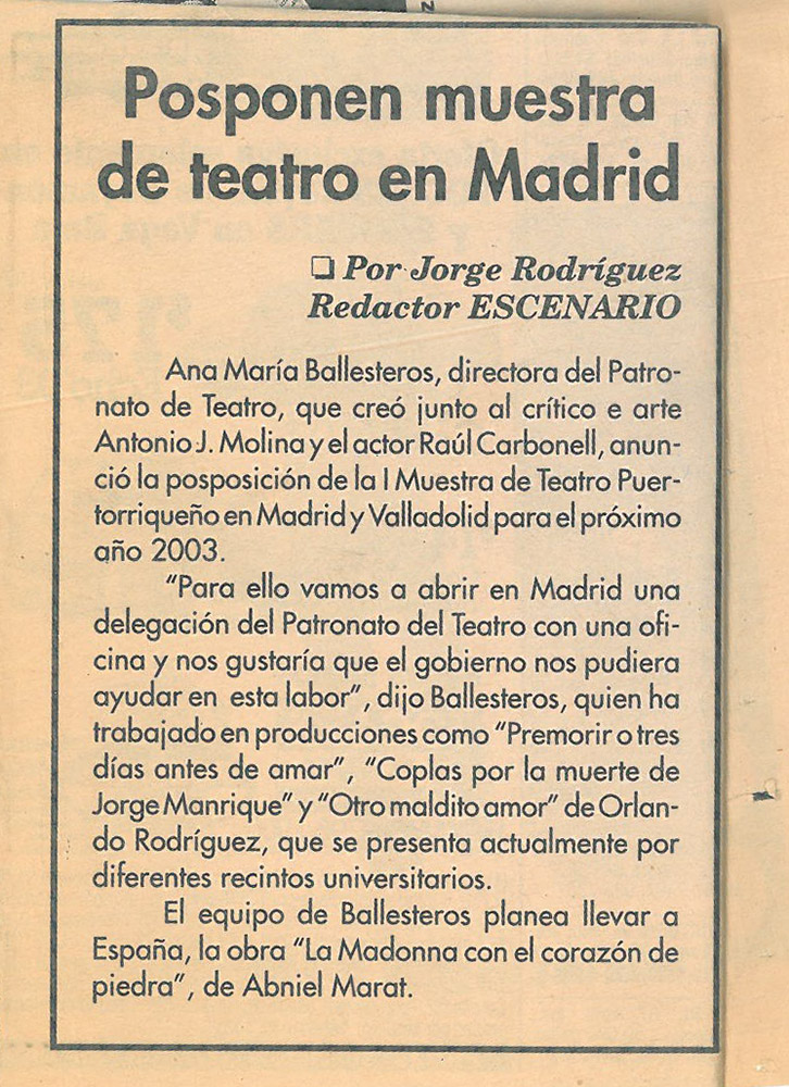 Intercambio Cultural con el ICP: Compañía Corsario de Valladolid, Director Fernando Urdiales, con la obra «Coplas por la muerte» de Jorge Manrique, invitados al Festival Internacional de Teatro Puertorriqueño y UPR e Interamericana.