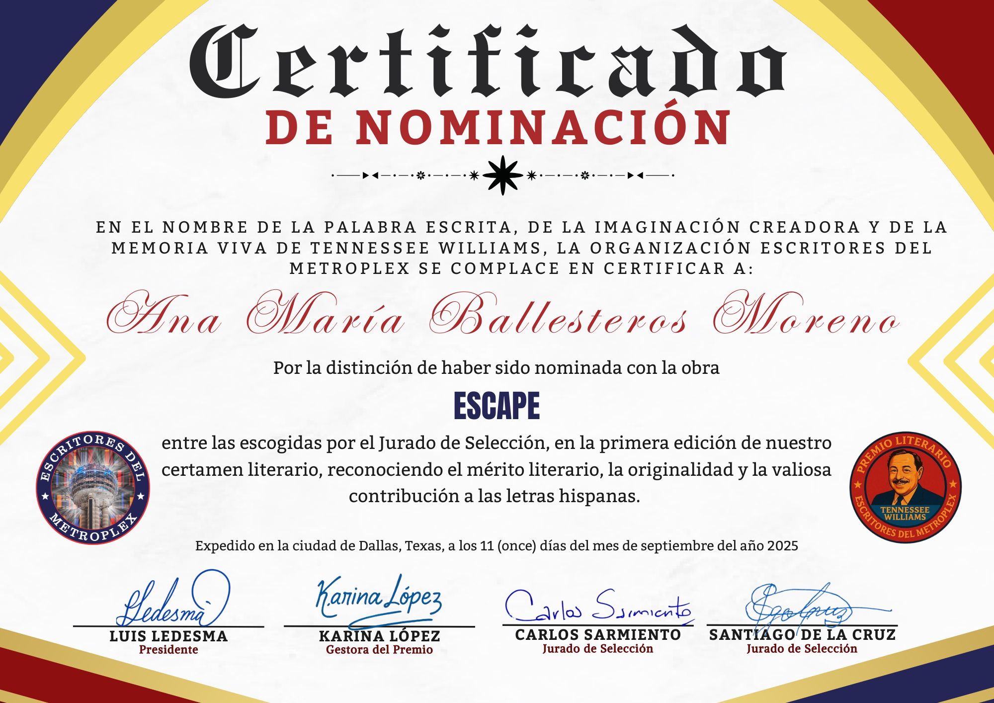 Ana Ballesteros, nominada con la obra «Escape» en la primera edición del certamen literario Escritores del Metroplex, por el mérito literario, originalidad y valiosa contribución a las letras hispanas, en Dallas (Texas, EE. UU.) en septiembre.